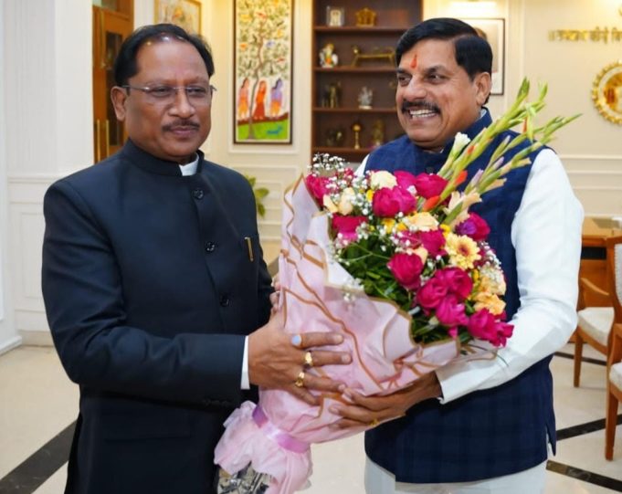 मुख्यमंत्री श्री विष्णु देव साय ने भोपाल प्रवास के दौरान मध्यप्रदेश के मुख्यमंत्री डॉ. मोहन यादव से रविवार की शाम समत्व भवन मुख्यमंत्री निवास में सौजन्य भेंट की।